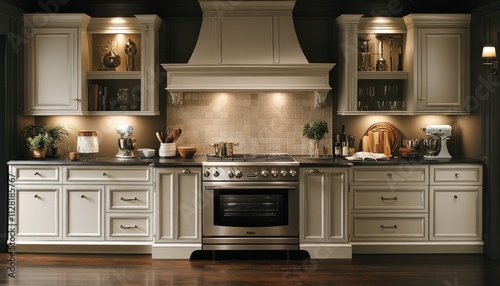 © Foxeye AI, Fototapeta premium Elegant cream kitchen with stainless steel appliances and dark countertops. This image showcases high-end kitchen design for home decor or real estate listings.