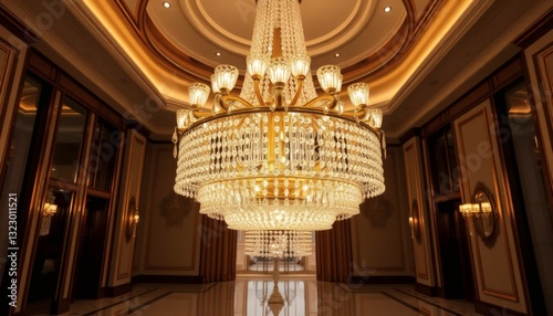 © Dollar, Obraz premium Elegant Crystal Chandelier Illuminates Grand Hallway in Luxurious Interior Design