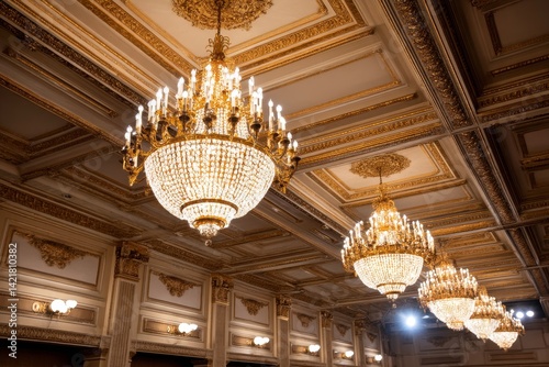 © Tida, Obraz premium Elegant Crystal Chandeliers in Grand Ballroom - Stunning crystal chandeliers illuminate a grand ballroom with ornate gold detailing on the ceiling. Luxury and elegance