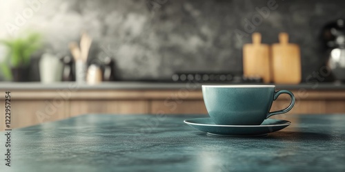 © CryptoCanvas, Obraz premium Elegant dark teal coffee cup mockup on kitchen countertop with minimalist design and ample copy space for branding or text customization