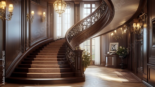 © Kevin, Obraz premium Elegant Dark Wood Curved Staircase Interior Design