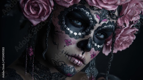 Naklejka premium Elegant Day of the Dead Makeup with Flowers and Dark Background