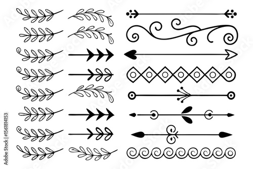 Fototapeta premium Elegant Decorative Line Art Dividers and Arrow Ornaments in Black Vector. Whimsical Swirls and Floral Borders for Graphic Design, Layouts, and Invitations.
