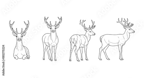 © LOBSTER LARRY, Naklejka premium Elegant deer line art: four graceful deer poses with antlers