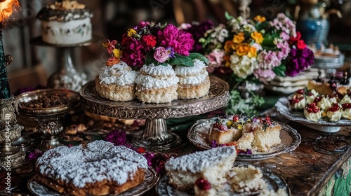 Naklejka premium Elegant Dessert Display with Flowers and Vintage Table Setting