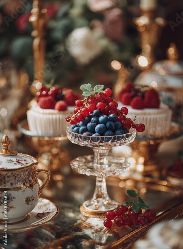 © Nombong, Naklejka premium Elegant dessert display with fresh berries on cupcakes. A glass bowl holds blueberries and red currants atop a tiered stand. Gold accents and ornate china add to the refined aesthetic