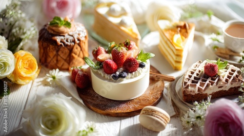 Obraz premium Elegant Dessert Presentation: Cakes, Waffles, and Macaron Arranged with Flowers