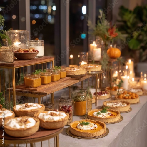 © Faizal, Naklejka premium Elegant Dessert Table at Evening Event Featuring Pumpkin Pie Tarts and Jars of Ingredients in Warm Light
