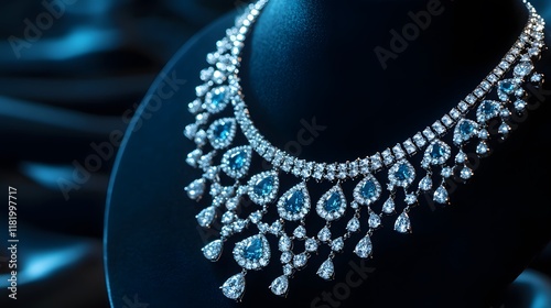 © Benjarin, Fototapeta premium Elegant Diamond and Blue Gem Necklace on Black Background Display