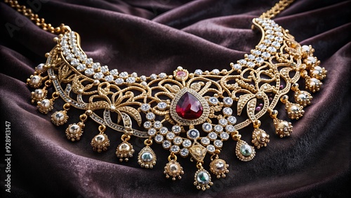 © Four888, Fototapeta premium Elegant diamond necklace with intricate gold filigree and sparkling gemstones, beautifully arranged on a black velvet background, exuding luxury and sophistication.