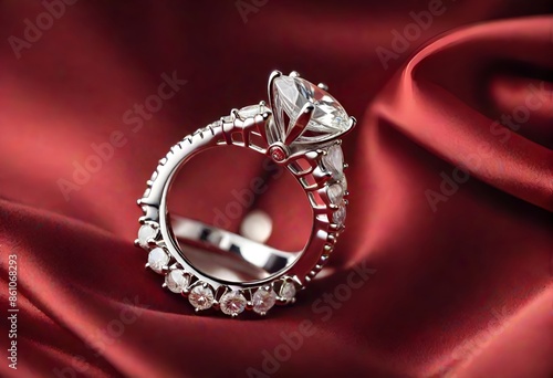 © iSky Media, Fototapeta premium Elegant diamond ring on red satin fabric