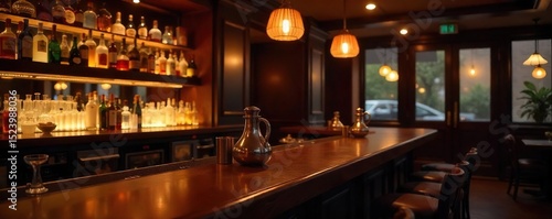 Fototapeta premium Elegant, dimly lit bar with polished wood, gleaming glassware, and stylish...