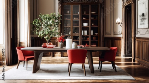 Fototapeta premium Elegant Dining Room Interior with Red Chairs and Wooden Table