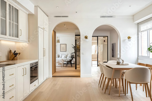 © sujeong, Fototapeta premium Elegant Dining Room with Archway and Soft Neutral Interior Design
