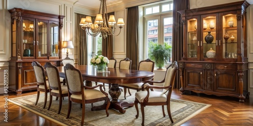 Obraz premium Elegant dining room with dark wood classical furniture, elegant, dining room, dark wood, classical, furniture