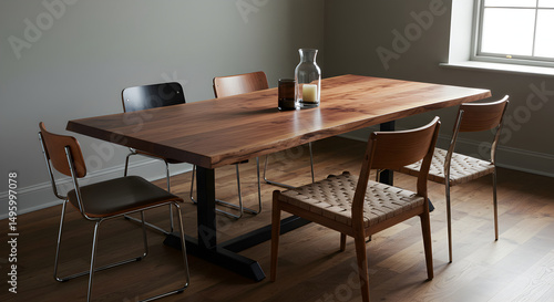 Fototapeta premium Elegant Dining Space With Wooden Table, Assorted Chairs, And Minimalist Decor