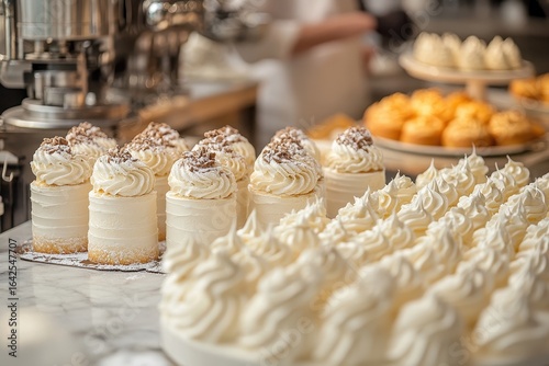 © isz, Naklejka premium Elegant Display of Creamy White Cakes and Cupcakes in Bakery