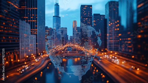 © Dilruba, Obraz premium Elegant double exposure of a graphic America map hologram against Chicago's skyline