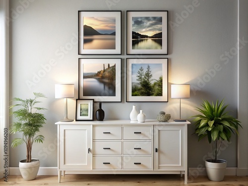 © Supittra, Fototapeta premium Elegant Double Exposure Photography of a Framed Collage on a Wall with a Stylish Dresser and Black Vase in a Modern Room Setting