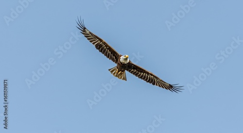 © Hendra, Obraz premium Elegant Eagle in Sharp Detail Flying Across Clear Sky with Minimal Landscape and Soft Daylight