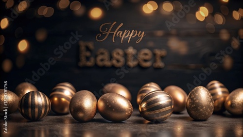 © OksKutsenko, Naklejka premium Elegant easter egg display with golden decorations and bokeh lights