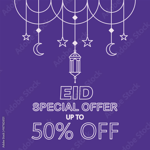 Naklejka premium Elegant Eid promotion design with white crescent moons, stars and lantern on purple background—perfect for festive sales and Islamic holiday marketing visuals