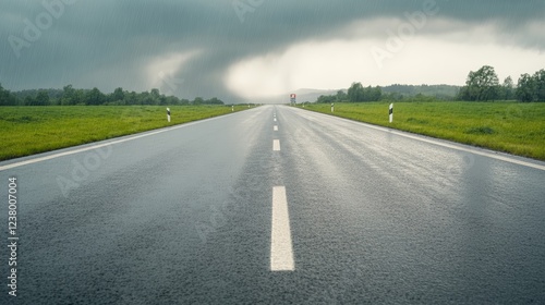 © fotogurme, Fototapeta premium Elegant Empty highway leading toward a massive tornado in the distance with road signs bending in the wind and rain starting to fall