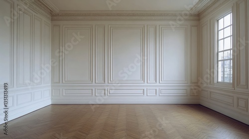 Obraz premium Elegant empty room features paneled walls and herringbone wood floor