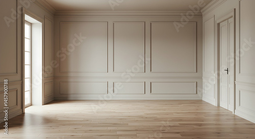 © suwannee, Obraz premium Elegant Empty Room with Warm Wooden Floor and Soft Natural Light