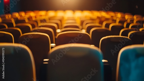 © ruangrit19, Obraz premium Elegant Empty Theater Seats in Cinematic Lighting and Dramatic Atmosphere