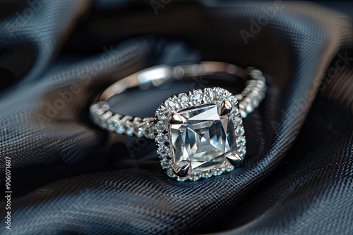 © Barra Fire, Fototapeta premium Elegant engagement ring with a cushion-cut moissanite and diamonds on a black fabric background