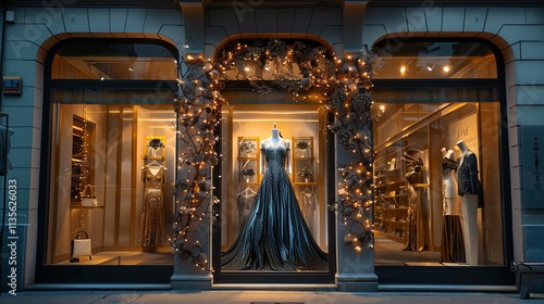 © nurionstudio, Obraz premium Elegant evening gown displayed in a luxury boutique window at night.
