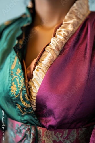 © Jaemie, Fototapeta premium Elegant Fabric Details: A Close-Up of a Colorful, Ornate Garment with Green and Purple Textures for Fashion Inspiration