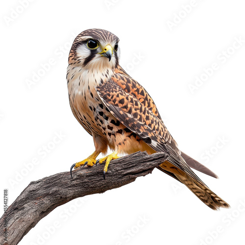 © Araf, Fototapeta premium Elegant falcon perched on weathered branch black background isolated on a transparent background
