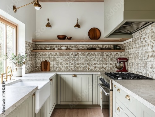 © Abian rasyid, Fototapeta premium Elegant Farmhouse Kitchen With White Cabinets And Tile Backsplash