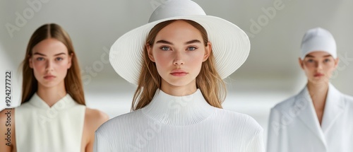 Fototapeta premium Elegant Fashion Models in Minimalist White Outfits and Hats in a Modern...