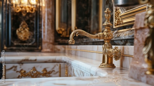 © Talha, Fototapeta premium Elegant faucet detail in kitchen with gold accents and marble countertops