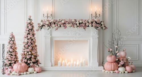 Fototapeta premium Elegant fireplace decoration: a white fireplace is adorned with soft pink flowers, pumpkin, and a lit candles creates a cozy and inviting ambiance.
