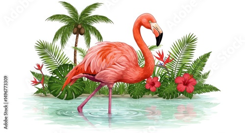 Fototapeta premium Elegant flamingo in tropical paradise, watercolor illustration