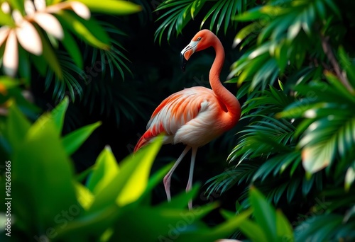 © wachiraporn, Fototapeta premium Elegant flamingo silhouette subtly framed by lush foliage within a square composition, shadow, graphic