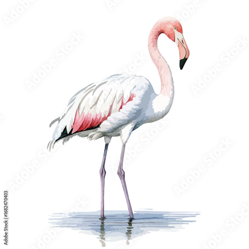 © Finkha, Obraz premium Elegant Flamingo Standing in Shallow Water with Reflected Ripples
