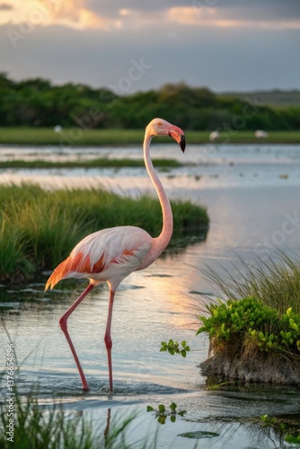 Fototapeta premium Elegant Flamingo Walking Through Calm Waters at Sunset Generative AI