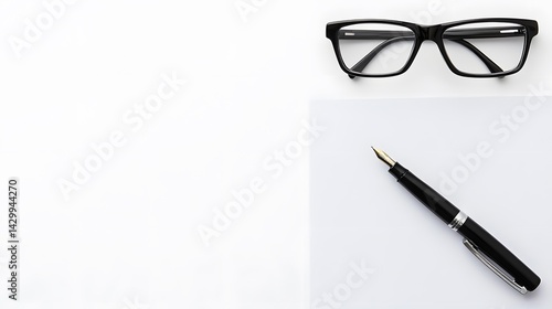 © Saimon, Fototapeta premium Elegant Flatlay White Background Black Fountain Pen Glasses Minimalist