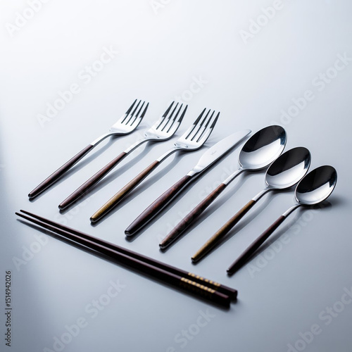 © Niamat, Fototapeta premium Elegant Flatware Set with Wooden Handles and Chopsticks on Gradient Surface