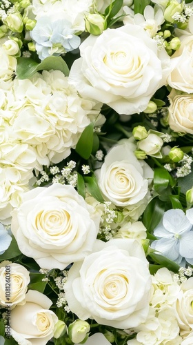 Fototapeta premium Elegant floral arrangement with white roses, hydrangeas, greenery, delicate blossoms in full bloom, graceful bouquet composition, nature beauty concept