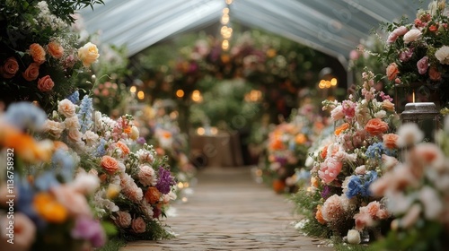 © Premium Illustration, Fototapeta premium Elegant floral arrangements with pastel roses and greenery lining aisle, wedding ceremony decoration, romantic event setup, soft natural light, garden venue, festive atmosphere