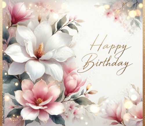 © Tadeusz, Naklejka premium Elegant floral birthday card with pink and white flowers, delicate calligraphy text 'Happy Birthday'