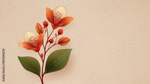 Fototapeta premium Elegant floral design with delicate orange flowers and green leaves on a textured beige background for creative projects and inspirational artwork