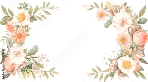 Fototapeta premium Elegant floral frame with soft pastel flowers and green leaves, perfect for...