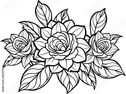 Fototapeta premium Elegant Floral Line Art Drawing with Roses and Leaves - Black and White Decorative Illustration